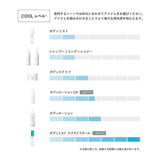 ※本シリーズは、メントール(清涼成分)を配合しているため、目や鼻に刺激を感じる場合があります。目の周りを含む顔、日焼けや除毛直後を避け、メントール系の冷感刺激に弱い方や、傷などお肌に異常のある方は使用しないでください。