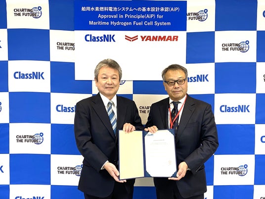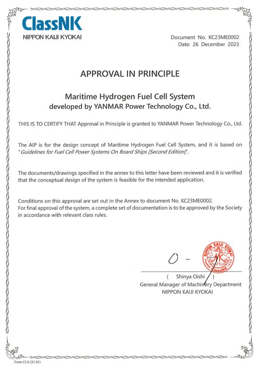 ヤンマーホールディングスのグループ会社であるヤンマーパワーテクノロジー株式会社(以下、ヤンマーPT)は、「舶用水素燃料電池システム(以下、本システム)」に関する基本設計承認(Approval in Principle、以下「AiP」)を日本海事協会(ClassNK)から日本で初めて取得※しました。本システムは、舶用分野でCO2、NOX、SOX、PMなどを排出しないゼロエミッション船の普及を目指す次世代の動力源で、システム筐体内にガスバルブユニット等の主要補機類を内蔵し、船体への搭載が容易な設計を実現しました。また、本システムの複数台並列連結や、舶用水素燃料電池モジュール(以下、本搭載モジュール)の搭載数変更などにより、さまざまな船舶の出力要求への対応が可能な設計になっています。なお、本システムおよび本搭載モジュールは、ClassNKの「燃料電池搭載船ガイドライン(第2版)」における燃料電池発電システムを対象とする審査要件が満たされることを、関連する規格に基づく試験で確認しました。今後、まずは水素の補給が比較的容易な沿岸を航行する旅客船や作業船、貨物船などへの本システムの適用をお客さまに提案していきます。