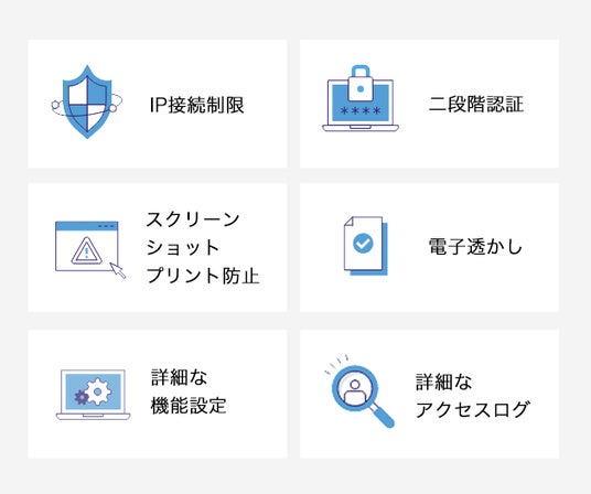 ・アクセス制御:ユーザーごとにアクセス権を設定し、必要な情報にのみアクセスできるようにします。これにより、情報の保護とコンプライアンスを確保します。