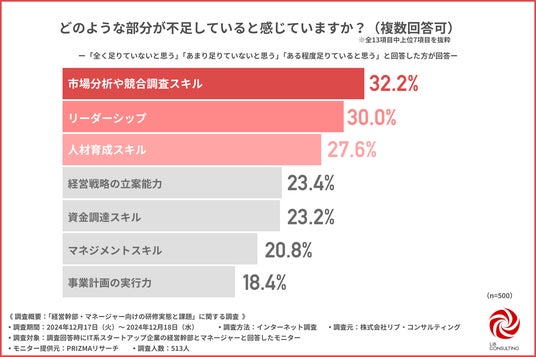 そこで、『全く足りていないと思う』『あまり足りていないと思う』『ある程度足りていると思う』と回答した経営幹部やマネージャーに「どのような部分が不足していると感じていますか?(複数回答可)」と質問したところ、『市場分析や競合調査スキル(32.2%)』が最も多く、次いで『リーダーシップ(30.0%)』『人材育成スキル(27.6%)』という結果になりました。