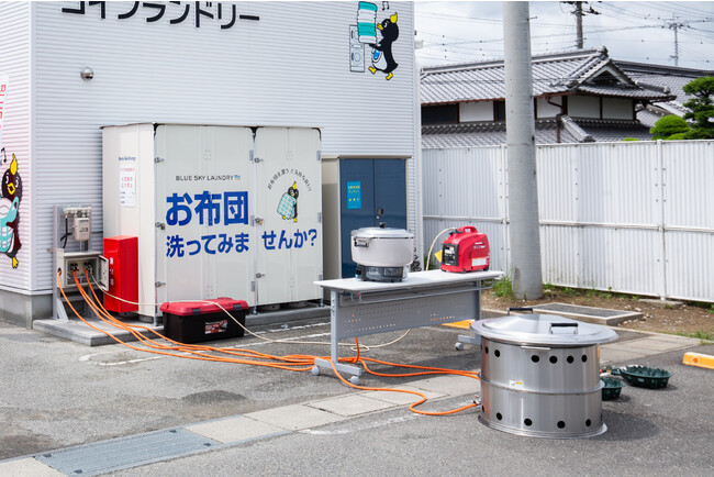 災害対応型ランドリーは「標準仕様」として3日分のLPガスを貯槽できるLPガスボンベ又はLPガスタンク、ポータブル発電機への接続が可能な設備を完備します。ポータブル発電機はコインランドリーの乾燥に使用されるガスを利用して発電する仕組みになっており、携帯電話充電などへ電力供給することが可能です。また、店舗にガスコンロ、ガス炊飯器を導入し、被災者向けの炊き出しが可能となり、コインランドリーを“一時避難所“として活用する事ができます。