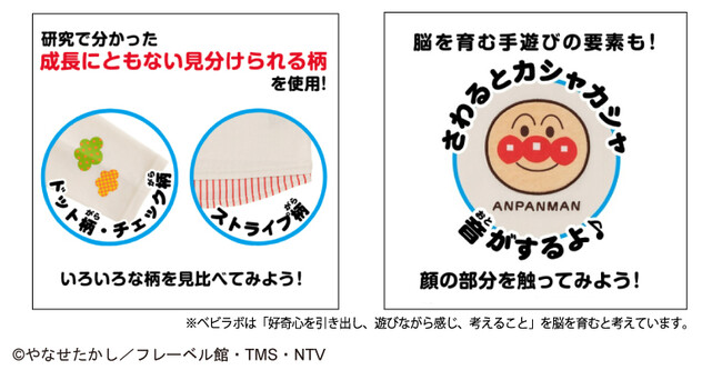 さまざまな検証で確認された、成長にともない見分けられる柄や、表情を見分けやすいアンパンマンの顔を袖のデザインに取り入れています。