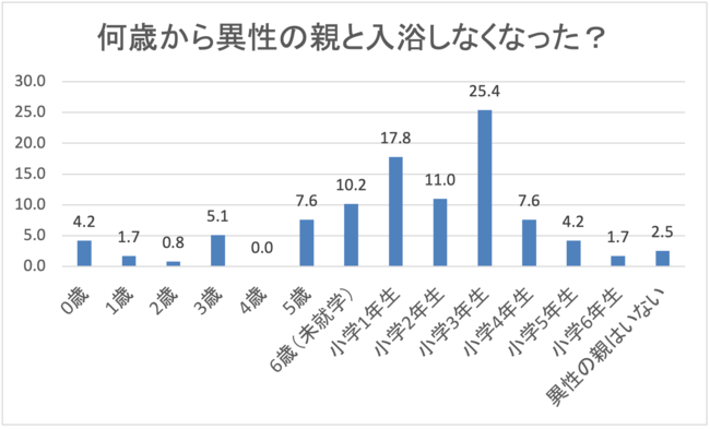 また、小学生の子が親と入浴をしているかを聞くと、「している」が78.1%、「していない」が21.6%となりました。「している」と回答した人に、誰と入っているかを聞くと、「父・母とも入っている」が76.5%、「同性の親のみ」が16.5%、「異性の親のみ」が7.1%となりました。「入浴していない」あるいは「同性の親のみ」と回答した人が異性の親と入らなくなったのは「小学3年生」が最も多い25.4%となりました(グラフ2)。