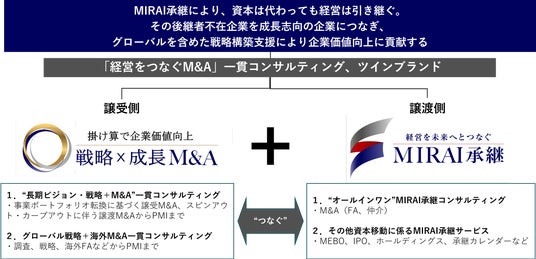 TCGでは、「経営をつなぐM&A」として、「MIRAI承継」(譲渡側)ブランドと「戦略×成長M&A」(譲受側)ブランドを提供しております。「MIRAI承継」コンサルティングで後継者不在によって廃業を選択せざるを得ない企業を成長企業につなぐことで、地域社会に活力を与え、永続的な成長が実現できると考えております。「戦略×成長M&A」一貫コンサルティングで成長志向の譲受企業におけるグローバルを含めた戦略構築を支援し、さらにM&A実行後のPMIも一貫して行います。