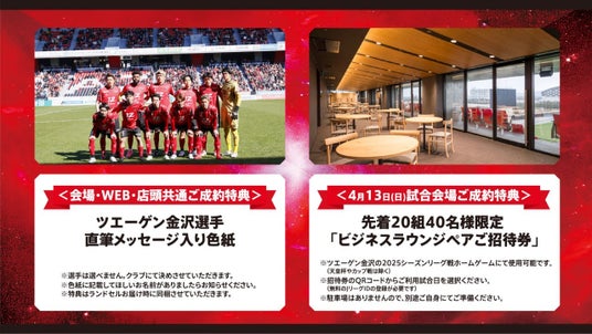 4月13日の試合会場にてご成約いただいた方、先着20組40名様にツエーゲン金沢のホームゲームで使えるビジネスラウンジ招待券をプレゼントいたします。ビジネスラウンジはスタジアムメイン側3階にあり、ピッチ全体を俯瞰して観戦できるほか、軽食や冷暖房のあるラウンジの利用もOK。ぜひ特別な空間でお子様とお過ごしください。