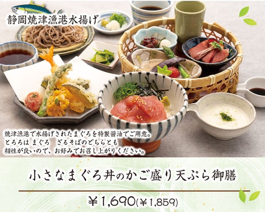 静岡焼津漁港水揚げのまぐろ丼や旬野菜の炊き合わせ等の小鉢がついたかご盛りに、季節の野菜を使用した天ぷら盛り合わせをセットでご用意。特製お出汁を使用した二八ざるそばは山かけとろろを加えて美味しさアップ!とろろはまぐろ丼とも相性が良いので、お好みでどうぞ。