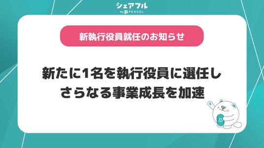 この度、シェアフルが掲げる"誰もの「はたらく」をひろげ、新しい「はたらく」をつくる"というミッションのもと、事業成長をさらに加速させるために、新たに執行役員を選任いたしました。