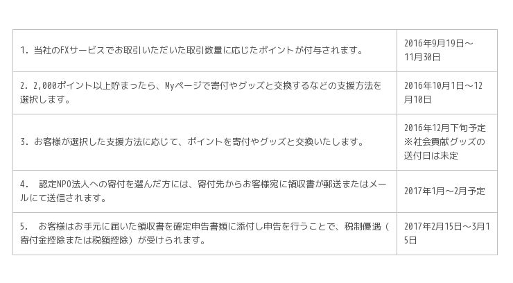 「ミッションプロジェクト」は、当社がご提供するFXサービスのお取引で付与されるポイントを使い、認定NPO法人に寄付をしたり、社会貢献を支援するグッズと交換できるポイントプログラムです。