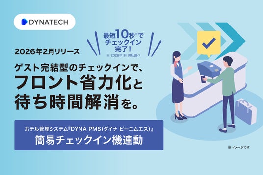 ホテル管理システム『DYNA PMS(ダイナ ピーエムエス)』を提供するバリューコマース株式会社(本社:東京都千代田区、代表取締役社長 最高経営責任者:香川 仁)は、低コストでフロントの業務効率化を実現する「簡易チェックイン機連動」をリリースいたします。