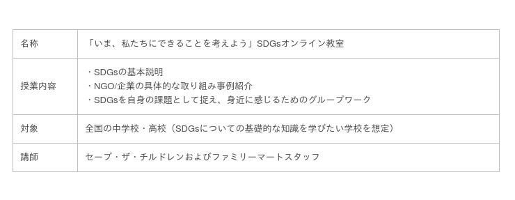 公益社団法人セーブ・ザ・チルドレン・ジャパン(本部:東京都千代田区、理事長:井田純一郎、以下セーブ・ザ・チルドレン)と株式会社ファミリーマート(本社:東京都港区、代表取締役社長:細見研介、以下ファミリーマート)は、次世代育成のための取り組みの一つとして、中高生を対象に、SDGs(持続可能な開発目標:Sustainable Development Goals)をテーマにしたオンライン出前授業「『いま、私たちにできることを考えよう』SDGsオンライン教室」を開始いたします。第1回目は、石巻市立桜坂高校(所在地:宮城県石巻市)にて、2021年3月18日(木)に開催いたします。