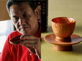 樹齢300年以上の松の木の中心部分からとれる材を使う「肥松」は、木の器とは思えないほどしっとりとした質感と、年月を経るごとに深い飴色の経年変化が特徴の木工品。この貴重な肥松を使ったアイテムを得意とするクラフト・アリオカに、小さな2種類の酒器を別注しました。使っては磨き、深まっていく肥松は、100年後も伝えていきたい魅力を備えています。