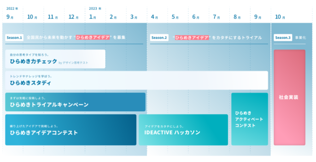 本プロジェクトはアイデアを創造するためのSeason.1とそのアイデアをカタチするためのSeason.2、さらには社会実装を支援し事業化するためのSeason.3の3つのフェーズから構成されます。