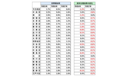 一方で注目すべきは、その「増加率の変化」です。令和6年には、令和5年と比較して都心5区(千代田区・中央区・港区・新宿区・渋谷区)およびその周辺エリアにおいて、世帯数増加率が明確に鈍化しました(表右)。さらに令和7年には、その減速がほぼ23区全域に波及しており、これまで牽引役であった都心部から外縁部まで一様に「ブレーキ」がかかる構図となっています。