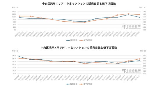 さらに注目すべきは、この流動性低下が湾岸エリアにとどまらない点です。中央区内の内陸エリアにおいても、2025年中盤以降は販売日数の長期化および値下げ回数の増加が確認されています。