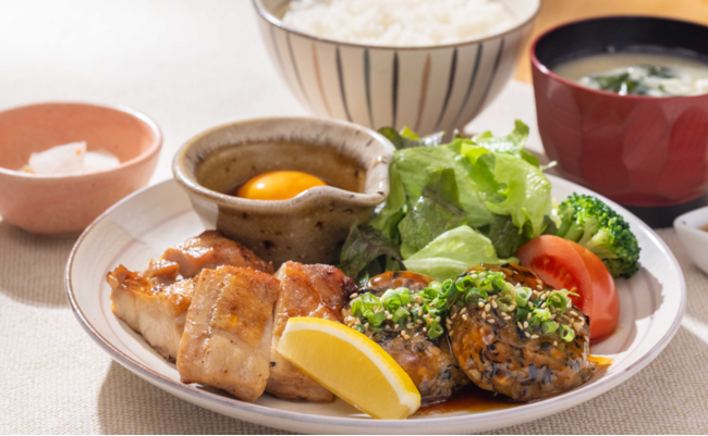 丁寧に香ばしく焼き上げた“コリコリ食感”の鶏つくねと、柔らかジューシーなもろみチキンの合い盛り定食です。2種類の食べ方で鶏肉を楽しむことができる、大戸屋渾身の自信作です。
