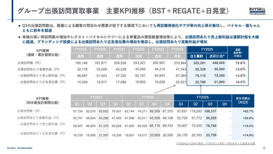 Q3の出張訪問数は、酷暑による顧客の問合わせ需要が低下する環境下ではありますが、リピート獲得強化やアポ率の向上等が奏功し、バイセル・福ちゃんともに前年を超過しました。