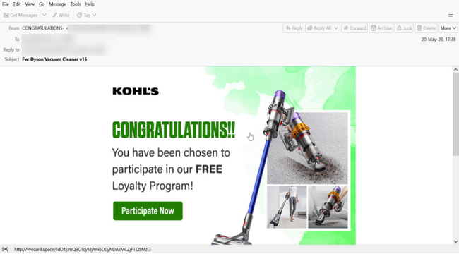 上の画像は、一見ごく普通の電子メールのようですが、これはアメリカの大手百貨店チェーンKohl’sからのメールを装う偽のメッセージで、ユーザーが無料のロイヤルティプログラムへの参加者に選ばれたことを伝えています。しかし、このURL先はKohl’sとは無関係です。