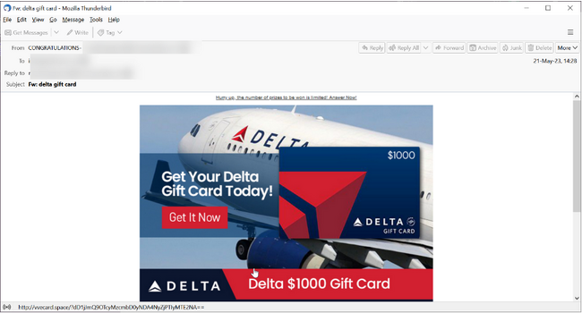 上画像も同様に、メールに含まれる画像は、デルタ航空のギフトカードのオファーとして説得力のある見た目をしています。しかし、この画像のURLもデルタ航空へのリンクではありません。