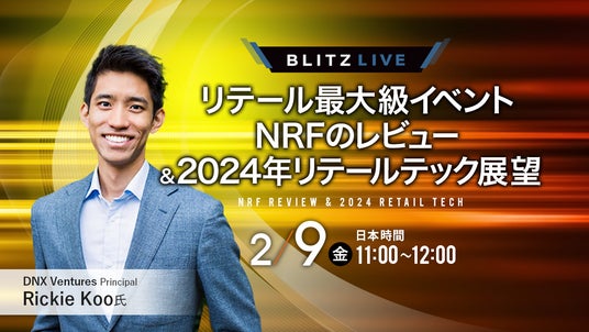 今回の「BLITZ LIVE」は、DNX Ventures PrincipalのRickie Koo 氏をお招きし、1月14日~16日に米ニューヨークで開催の「NRF 2024: Retail's Big Show」の解説やNRFで観測されたトレンドも踏まえたリテールテック領域における最新事例と2024年の展望等の解説をしていただきます。