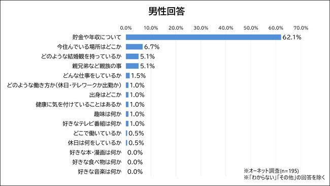 また、女性については「どんな仕事をしているか」が2番目に多い回答となっています。「どのような生活をしているかを知るため」という理由も挙げられており、女性にとっては気になる話題のようです。