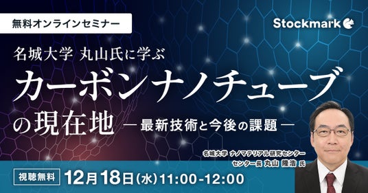 最先端の自然言語処理AIを活用した情報収集サービス『Anews・Astrategy』を提供するストックマーク株式会社(以下、「当社」)はオンラインセミナー『名城大学 丸山氏に学ぶ カーボンナノチューブの現在地 - 最新技術と今後の課題』を12月18日(水) に開催致します。