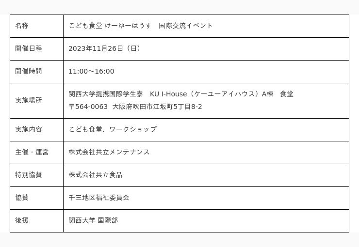「ドーミー」の名称で全国約500棟以上の学生寮・社員寮を展開する株式会社共立メンテナンス(以下、共立メンテナンス/代表取締役社長:中村幸治/本社:東京都千代田区)は、運営寮の関西大学(学長:前田裕/場所:大阪府吹田市)の提携国際学生寮「KU I-House」にて11月26日(日)に『こども食堂 けーゆーはうす 国際交流イベント』を開催いたします。