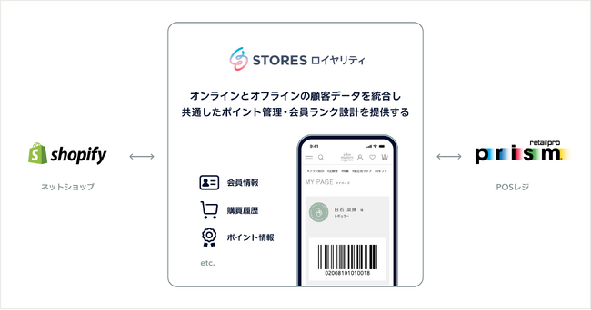 STORES ロイヤリティ では、STORES ネットショップ とあらゆるPOSレジを連携することで店舗とネットショップの会員情報や購買情報を一元化し、共通のポイント管理や会員ランクなど、オムニチャネルでのロイヤリティプログラムを実現できます。