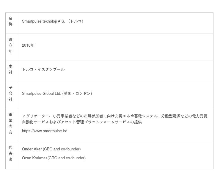 当社はこのたび、トルコ・英国を拠点とし、電力事業者や大規模需要家などの市場取引参加者向けに、再生可能エネルギーなど電力の短期取引マネジメントに関するソリューションを提供する「Smartpulse teknoloji A.S.」(以下、スマートパルス社)へ出資しました。当社は、今回の出資およびスマートパルス社との関係強化を通じ、再生可能エネルギー(以下、再エネ)導入拡大を見すえて、エネルギーアグリゲーション事業における付加価値の高いサービス提供を目指します。