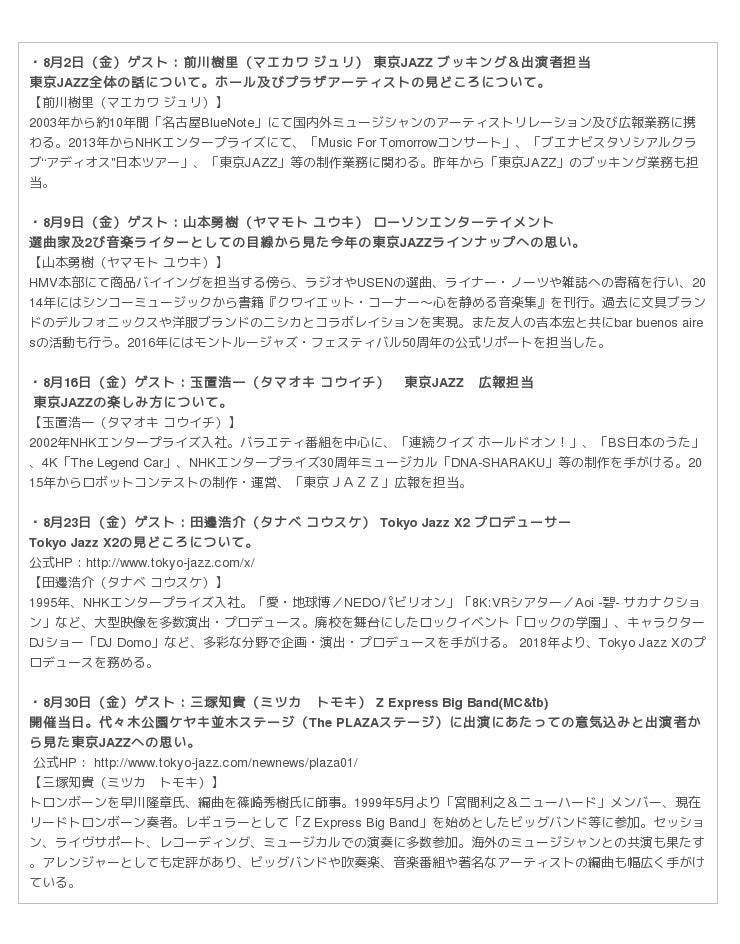 内容:音楽情報番組「MORNING MUSIC MARKET」の毎週金曜日放送内にて、「東京JAZZの楽しみ方」を多彩なゲストとともに5週間にわたってお届けします。