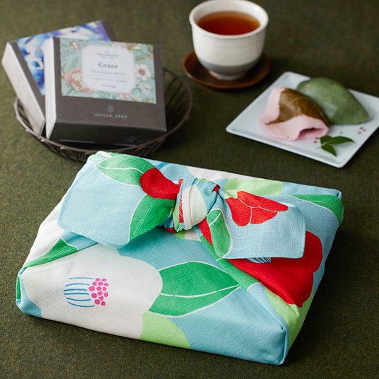 この度新たにつばき(椿)の花をモチーフにしたふろしきを期間限定でご用意し、nittoh.1909こだわりの紅茶をさらに華やかなギフト仕様にいたしました。