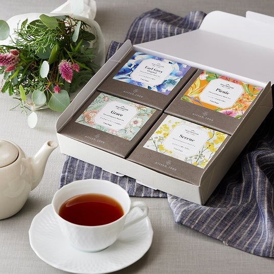 和紅茶をベースにアールグレイ、マンゴートロピカル、ピーチ&マスカット、ハニーレモンの香りづけをした、4種類のフレーバードティーが入ったギフトセットです。「そのときの気持ちに寄り添うお茶」をテーマに、パッケージには各フレーバーに合わせたメッセージが記載されています。大切な方へのプレゼントにおすすめです。