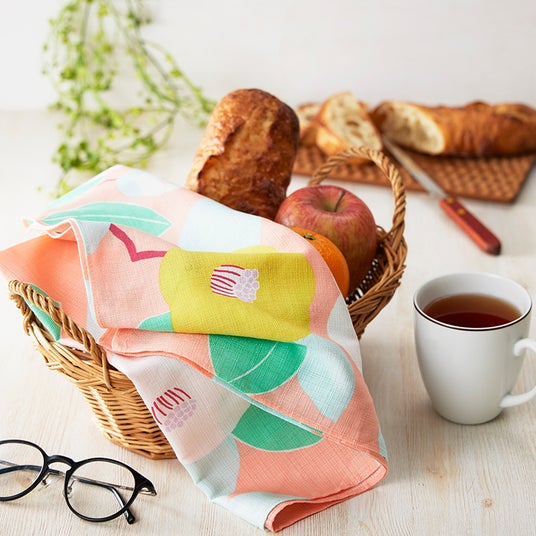 2025年の母の日・父の日のために選んだふろしきは、日本の代表的な花木のひとつであるつばき(椿)をモダンな色使いで表現したものです。
