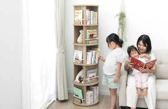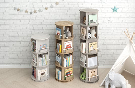 360度回転するギミックにわくわく!“回転式絵本ラック”を発売開始!幼少期から大人まで使えるスリムなデザインでお部屋の角にスマート配置!