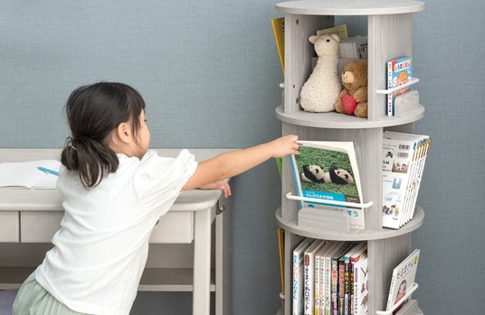 こちらのラックは360度まわせる回転式なので探している絵本を一目で見つけやすくなり、どの本も手にとりやすいところが特徴です。また、お子様でも簡単にくるくる回して取り出せる楽しさを感じられるので、本を読む習慣やジャンルごとに絵本を整理できるといった片づけの習慣を育むこともできます。