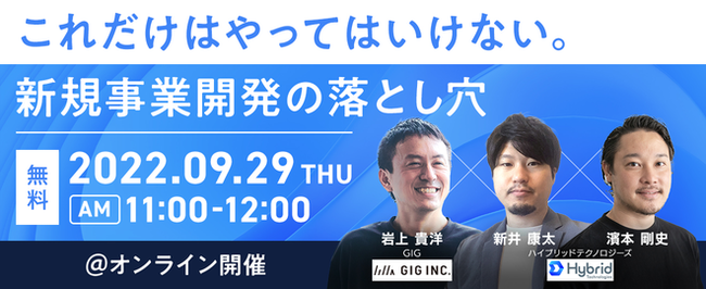 今回は、デジタルコンサルティング分野で事業展開する株式会社GIG 代表取締役の岩上氏、創業以来250以上のDXプロジェクトを動かしてきた株式会社ハイブリッドテクノロジーズ 執行役員 営業部部長の新井氏、同社 執行役員 経営企画部部長の濱本氏、DX業界の最前線を走る以上3名が、新規事業開発における「落とし穴」と、それを避ける方法を語っていきます。
