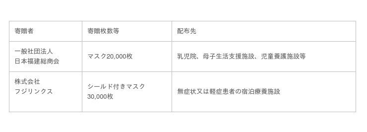 2020-04-16 東京都 マスクの寄贈及び配布について Tweet ~新型コロナウイルスに関する東京都からのお知らせ~ この度、2団体から東京都にマスクの寄贈があり、下記のとおり配布しますので、お知らせします。 記 [表: https://prtimes.jp/data/corp/52467/table/214_1.jpg ] 企業プレスリリース詳細へ PR TIMESトップへ 公式ツイッター Follow @Straightpress 最新情報をTwitterで受け取ろう! 公式フェイスブックページ 最新情報をFacebookで受け取ろう! 前の記事 一覧へ戻る 次の記事