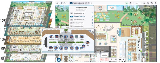 ▲TODA BUILDINGの各フロアをovice上に再現。リアルで出社している社員とリモートワークの社員が同じ空間に「出社」して勤務することが可能に。