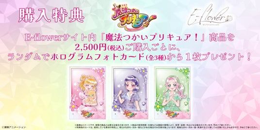 E-flower通販サイト内で『魔法つかいプリキュア!』商品を2,500円(税込)ご購入ごとに、ランダムで「ホログラムフォトカード(全3種)」から1枚プレゼント。