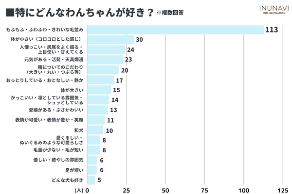 特に好きなわんちゃんでは「もふもふ・ふわふわ・きれいな毛並み」が113人と最も多い回答になりました。