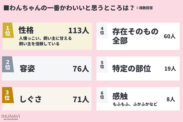 わんちゃんの一番かわいいと思うところは「性格」に関するものが113人で最多!