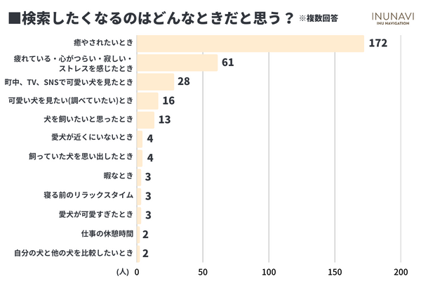 2番目に多かった「疲れている・心がつらい・寂しい・ストレスを感じたとき」61人も、読み解けば=癒されたいと考えられるため、多くの人が癒しを求めて「犬 かわいい(可愛い)」と検索しているようです。