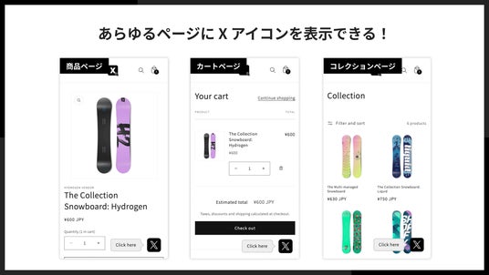 トップページはもちろん、商品ページ、コレクションページ、ブログページなど、ストア内のあらゆるページにXアイコンを表示できます。この包括的な表示機能により、訪問者がどのページを閲覧していても、常にSNSへの接点を提供できます。商品を見ている最中でも、ブログ記事を読んでいる時でも、訪問者は気軽にあなたのX(Twitter)アカウントをフォローできるため、コンバージョンの機会を逃しません。