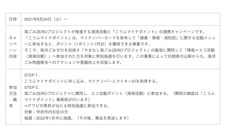 海なしやまなし発!海ごみZEROプロジェクトは、甲府市と連携して「こうふマイナポイント」(https://www.city.kofu.yamanashi.jp/joho/event/kofumainapoint.html)のエコ活動参加者を対象に、抽選で「アワビの煮貝」をプレゼントするキャンペーンを実施します。このキャンペーンは、日本財団が推進する海洋ごみ対策プロジェクト「海と日本プロジェクト・CHANGE FOR THE BLUE」の一環で開催するものです。