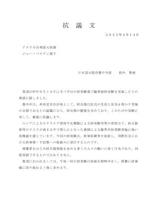アメリカ合衆国が、昨年6月と9月に、核実験を実施したとの報道に接し、豊中市は4月14日付でアメリカ合衆国大統領宛に長内繁樹市長名の抗議文を在本邦アメリカ大使館へ送付いたしました。