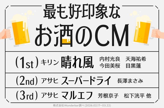 株式会社Wunderbar(本社:東京都渋谷区、代表取締役:長尾慶人)は、自社メディア「Skettt Column(スケット・コラム)」にて、「2026年に25歳になるタレントの中で今後お酒のCMに出演してほしいタレントランキング」および「最も好印象なお酒のCMランキング」を発表いたしました。