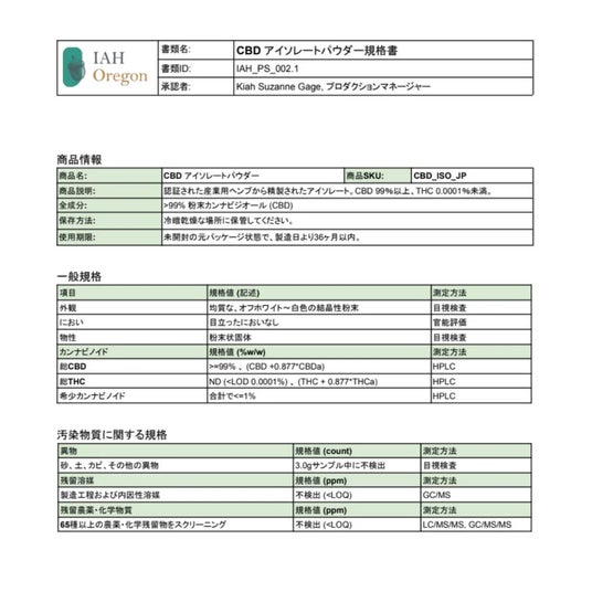 品質・安全基準の遵守:THC含有量0.3%未満のヘンプ、農薬・重金属・微生物の検査済み