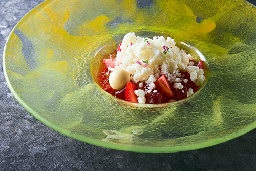 メインとなるスイーツは2種類ご用意。1つはあまおういちごと美山牛乳を使用し、懐かしい “いちごミルク”を現代風にアレンジした一品。ほんのり香るリキュールとさっぱりしたライムで大人の味わいに仕上げました。もう1つは、コースの中でも一際目を引く、ナポレオンミルフィーユと掛け合わせたハイブリッドパルフェ。あまおういちごをふんだんに使用し、いちご本来の甘さを引き立たせました。