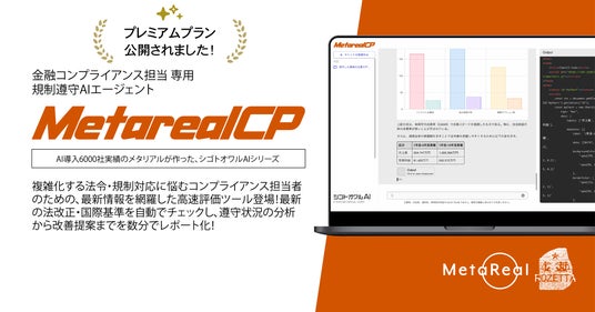業種特化の専門AI開発・運営を行うメタリアル・グループの株式会社ロゼッタ(本社:東京都千代田区、代表取締役:五石順一)は、規制遵守状況評価レポート作成AIエージェント「Metareal コンプライアンス」(以下、Metareal CP)を1日20回・月200回使える月額5万円(税込)のプレミアムプランを7月18日(金)より提供開始しました。