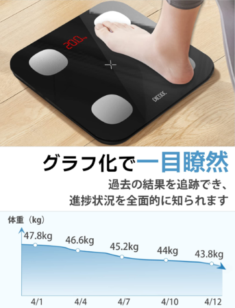 5.スマホ連動するとデータ同期が実現し、Bluetoothで体組成計をスマホと連携すれば、測定データが専用アプリへ自動転送&記録し、充実な測定データでグラフを作成して、体測定値の変動傾向により、ダイエットや体調管理、トレーニングなども最適な体組成計です。