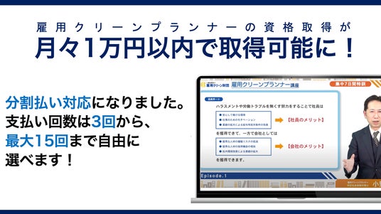 ハラスメント対策資格「雇用クリーンプランナー」認定講座(税込99,000円)が、分割払いに対応しました。これにより、月々1万円以内(最大15回払い)の支払いで、資格取得を目指すことが可能になりました。この新プランの導入で、より多くの方が社会的に意義ある資格に挑戦できる環境を整えました。